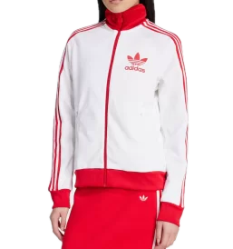 Track top Heritage da donna bianco e rosso, vestibilità regolare e anima sportiva iconica. Un capo dallo stile urban raffinato, con zip integrale, colletto risvoltato e materiali sostenibili.