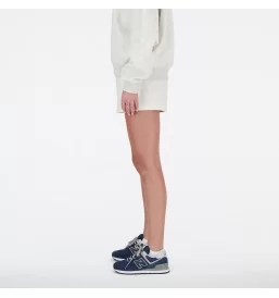 Pantaloncini New Balance Sport Essentials French Terry da donna nel colore Ash Heather grigio chiaro, perfetti per il tempo libero e per un look sportivo comodo e versatile.