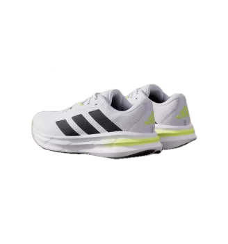 Scarpe da running adidas Galaxy 7 da uomo in bianco e nero con piccolo dettaglio giallo. Calzata regolare, intersuola Cloudfoam e design sportivo essenziale per comfort e performance quotidiane.