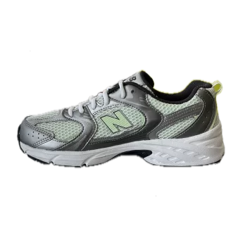 New Balance scarpe 530, grigio con dettagli verde , progettate per ragazzi. Tomaia in pelle sintetica e tessuto, intersuola con tecnologia ABZORB per ammortizzazione e resistenza agli impatti.