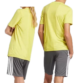 Train Essentials 3-Stripes Junior: completo sportivo unisex con t-shirt Giallo e pantaloncini Grigio in tessuto traspirante.